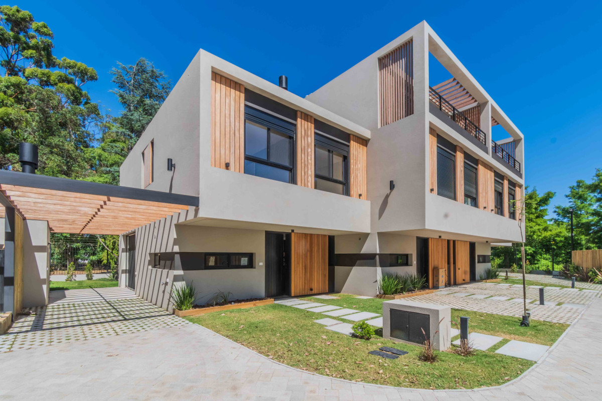 Planta baja: Living comedor amplio con estufa a leña y salida a jardín con parrillero Cocina integrada con isla Toilette Box de guardado Planta alta: 3 dormitorios 2 baños completos, principal en suite Cochera abierta Gastos comunes $11.000 Complejo con seguridad y piscina de uso común.
