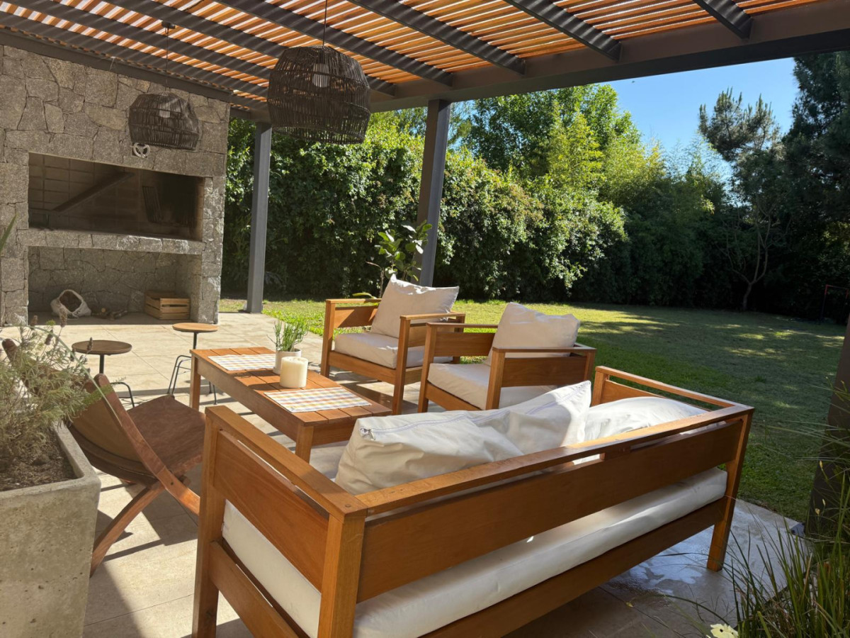 Cómoda casa rodeada de naturaleza, con amplios espacios para disfrutar de este verano en Familia Amplio living comedor con salida al jardín y al parrillero 3 dormitorios muy cómodos con vistas al jardín, el principal en suite logrando salida al jardín 2 baños completos más Toilette Cocina integrada al living muy luminosa, cuenta con una isla para unir a la familia en los desayunos Lavadero y despensa Entrada para autos con portón eléctrico
